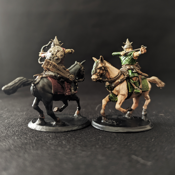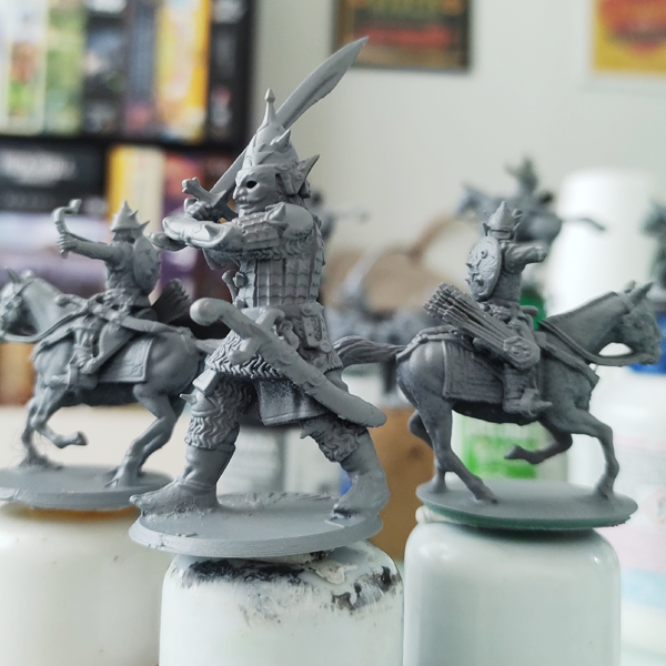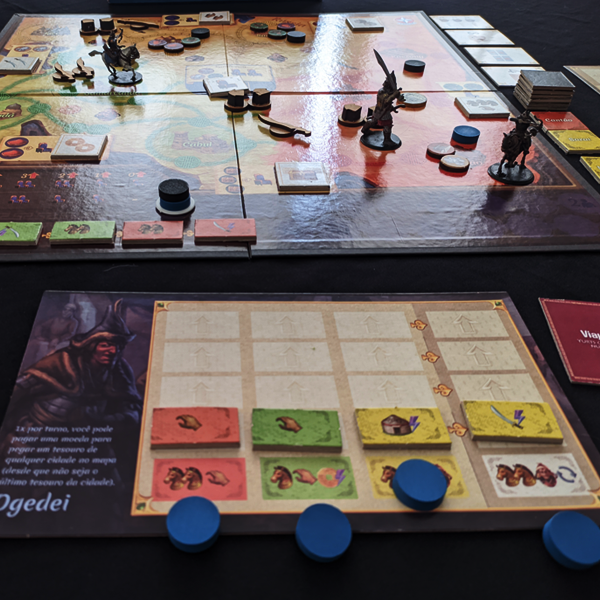 As minis foram impressas em resina, para que não perdessem os detalhes. Os cavaleiros são os jogadores e o Khan coloquei ele um pouco maior que os cavaleiros para destacar mais no tabuleiro.