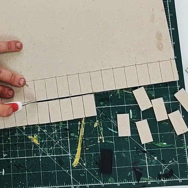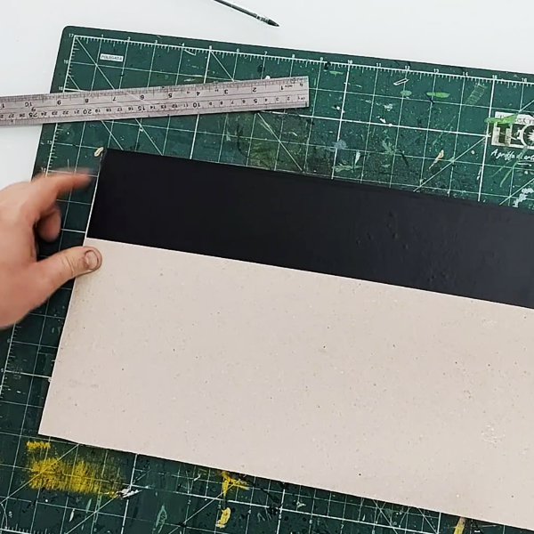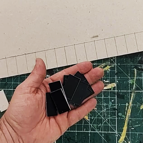 Fiz as medidas no papel paraná e atrás fixei um vinil preto adesivo. Depois de cortado colei cada uma das fichas com cola branca extra.