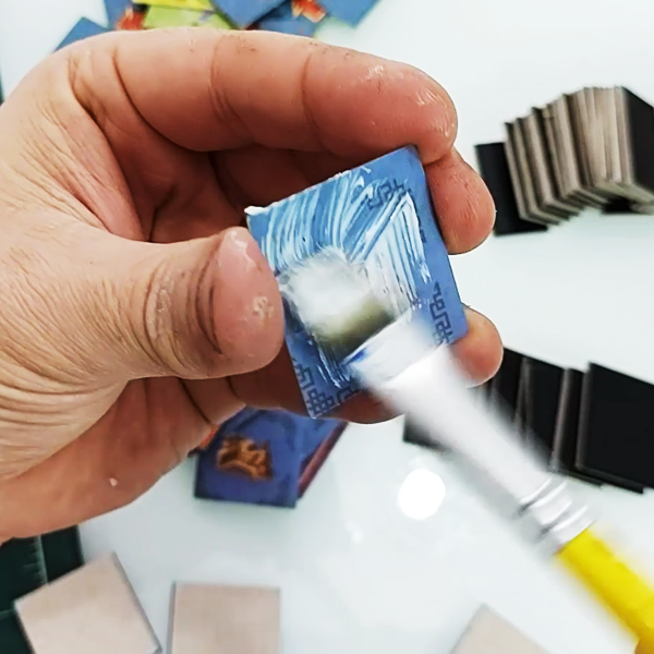 Logo depois, resolvi colar as cartas em uma placa de papel paraná de 1,2mm. E na parte de trás desses tiles eu fiz uma arte no photoshop seguindo a identidade original.